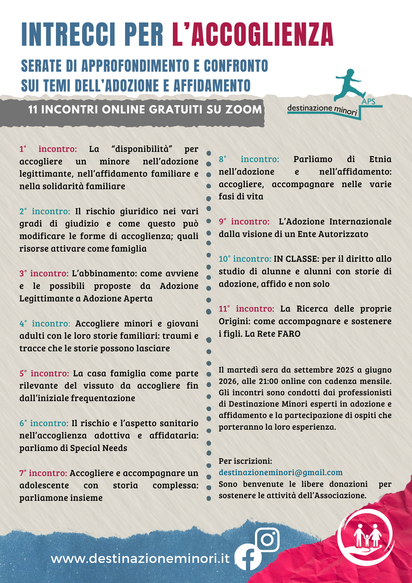 Serate di approfondimento e confronto sui temi dell'adozione e affidamento. 12 incontri online gratuiti su ZOOM. Il giovedì sera
